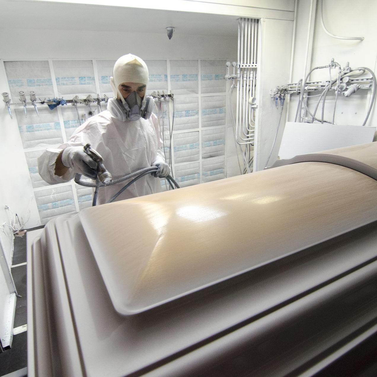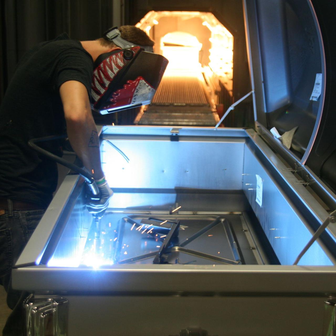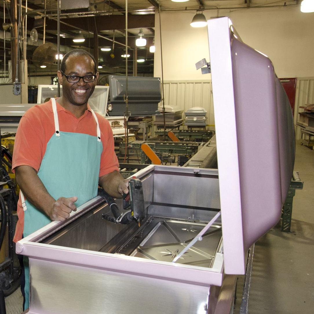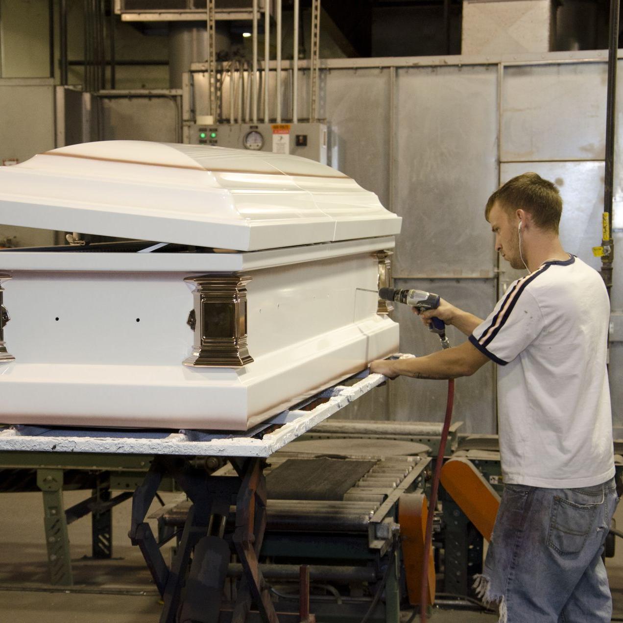 In the metal fabrication department, the process starts with raw metal parts that have been pre-stamped from cold-rolled steel coils. Several welding stations are set up to weld the portion of the casket that forms the box. Simultaneously with the fabrication of the casket box, a group of welders will be welding together the parts of the pre-stamped lid. After all the welds are made on the box and lids, these parts pass through several people who will grind off the excess welds, making all areas of welding smooth. Once all grinding and welding is complete, the casket will then pass through an inspector who inspects the casket for any metal fabrication defects prior to moving forward into the paint department.