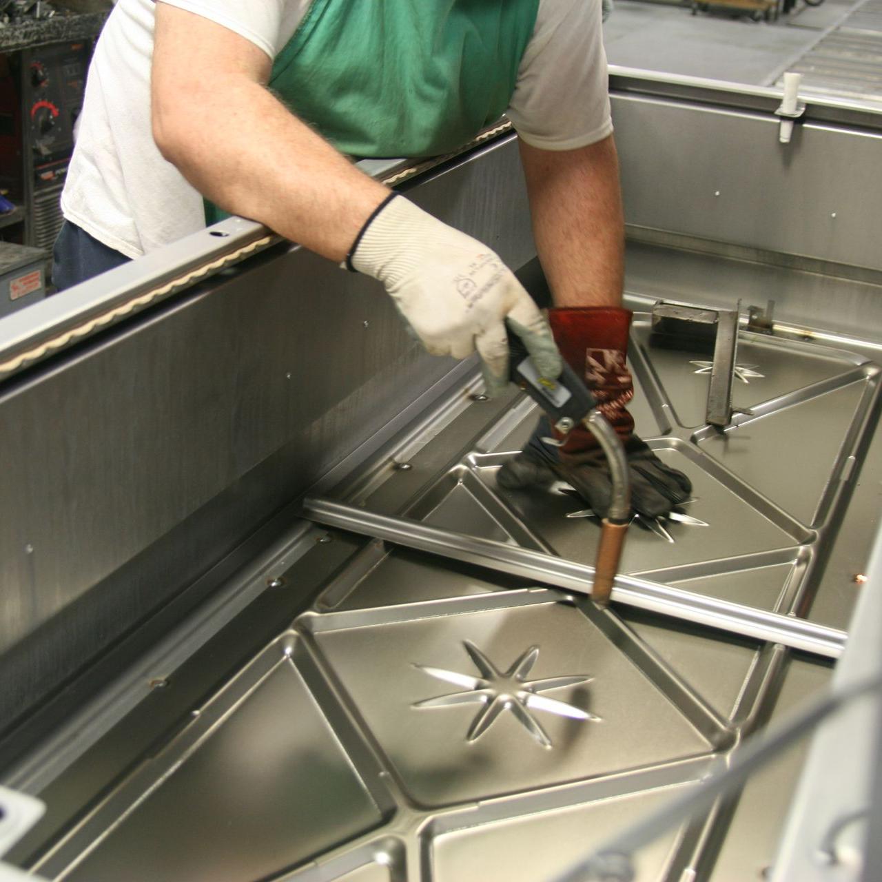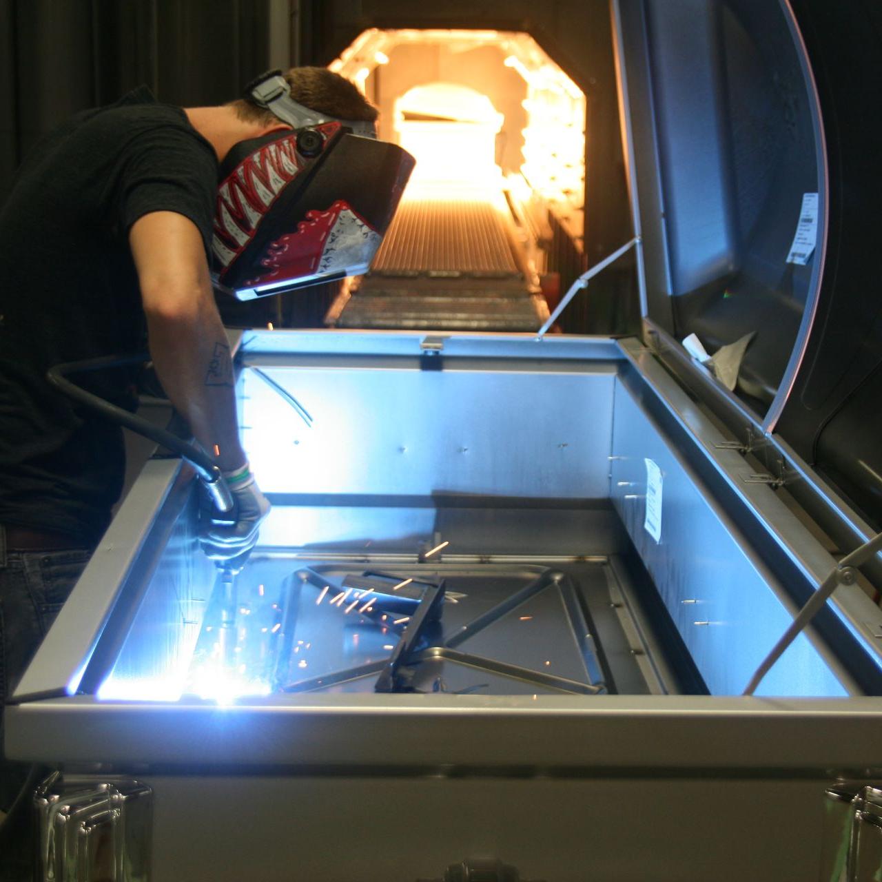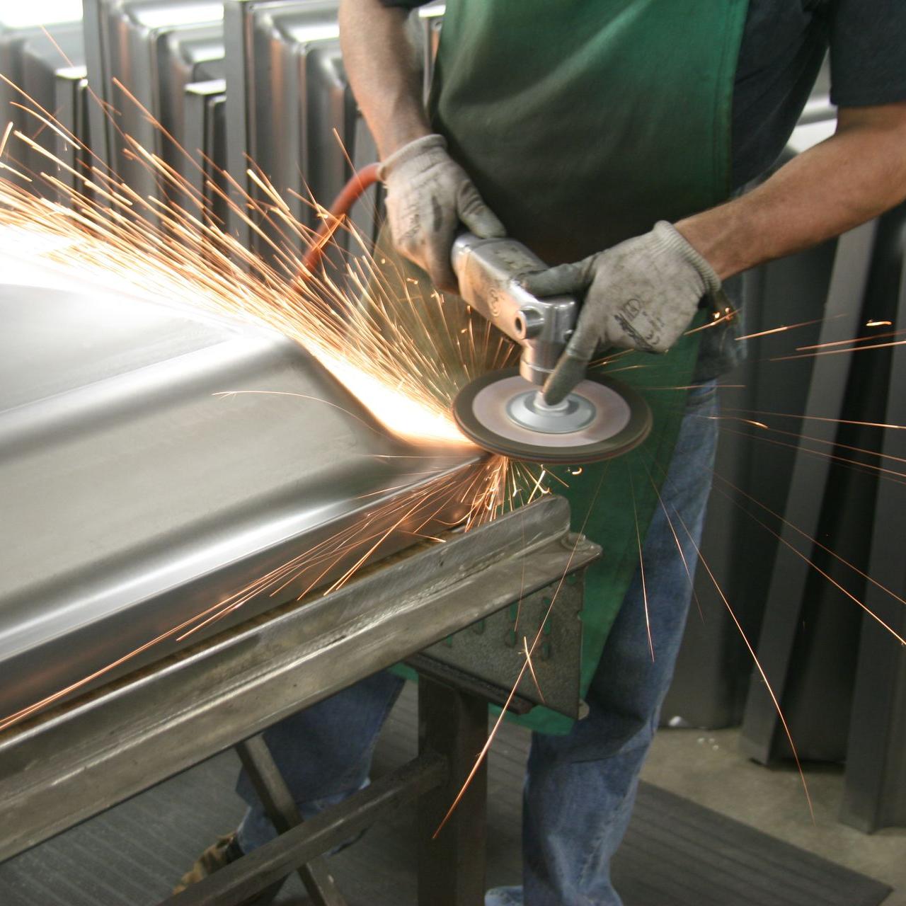 In the metal fabrication department, the process starts with raw metal parts that have been pre-stamped from cold-rolled steel coils. Several welding stations are set up to weld the portion of the casket that forms the box. Simultaneously with the fabrication of the casket box, a group of welders will be welding together the parts of the pre-stamped lid. After all the welds are made on the box and lids, these parts pass through several people who will grind off the excess welds, making all areas of welding smooth. Once all grinding and welding is complete, the casket will then pass through an inspector who inspects the casket for any metal fabrication defects prior to moving forward into the paint department.