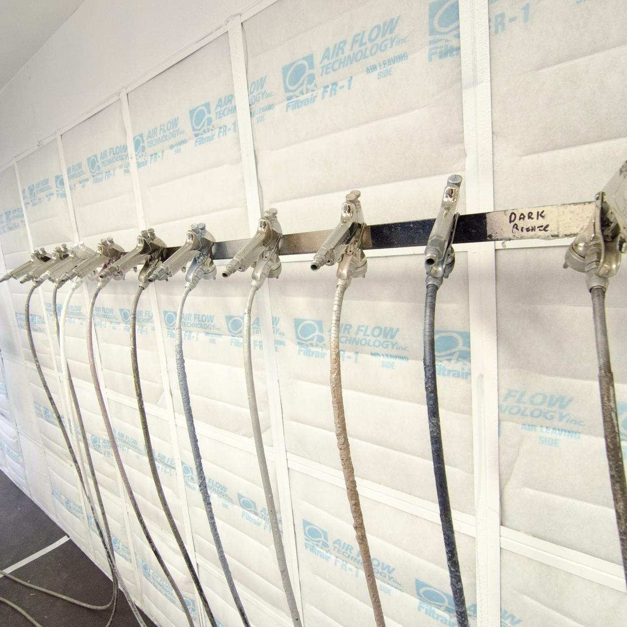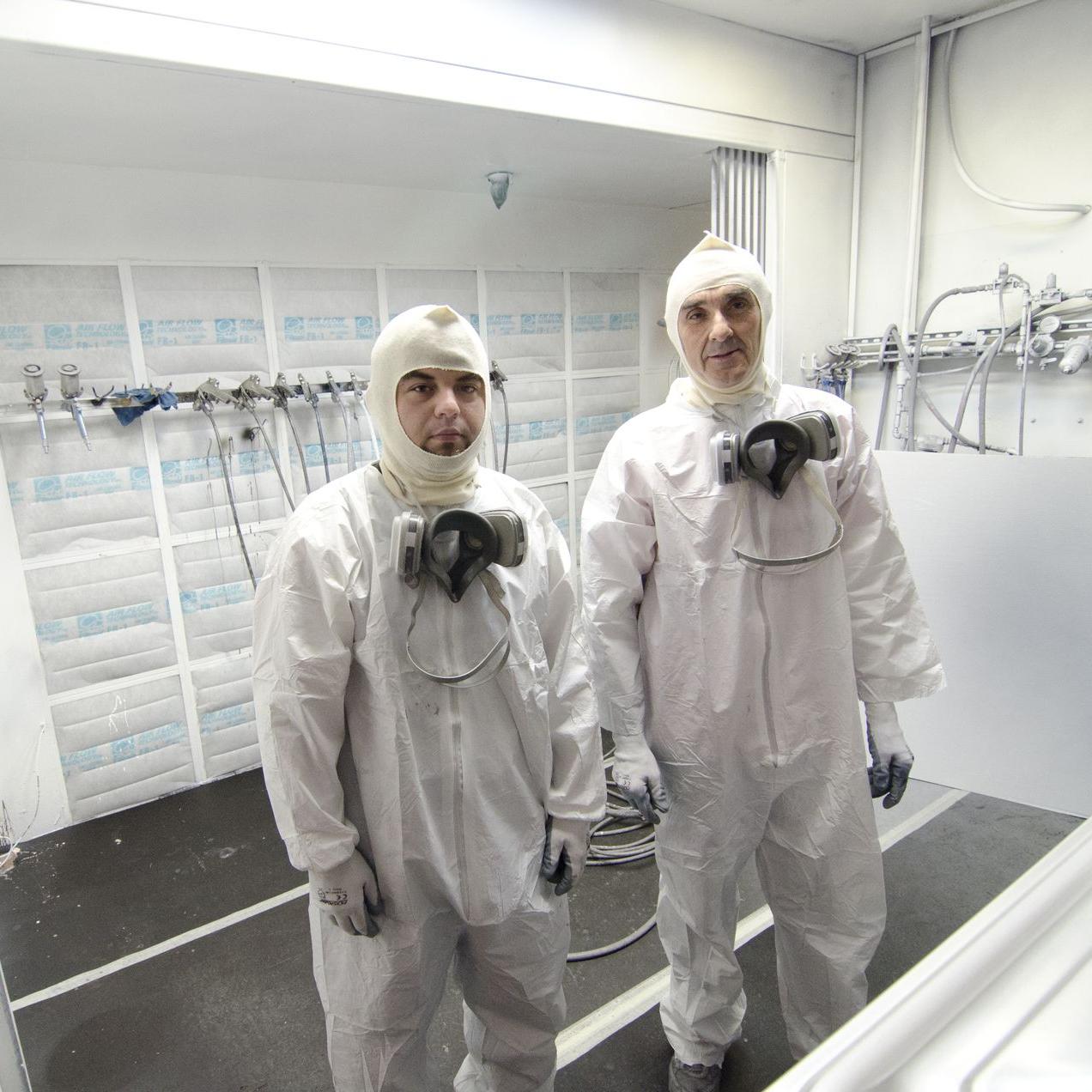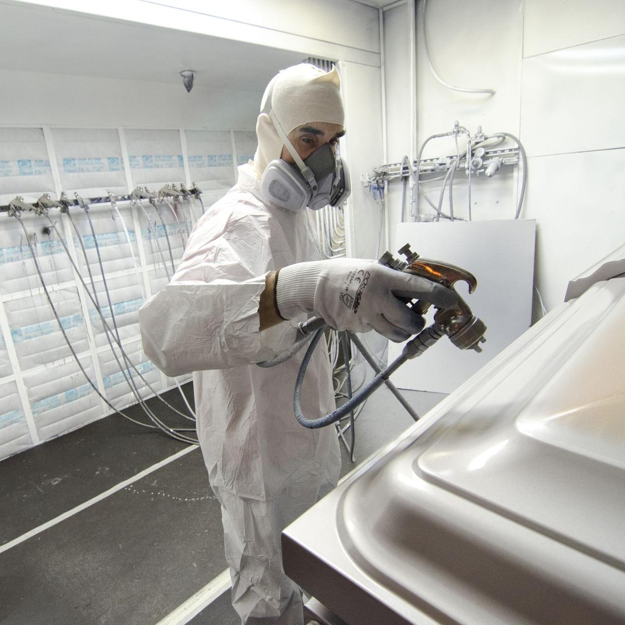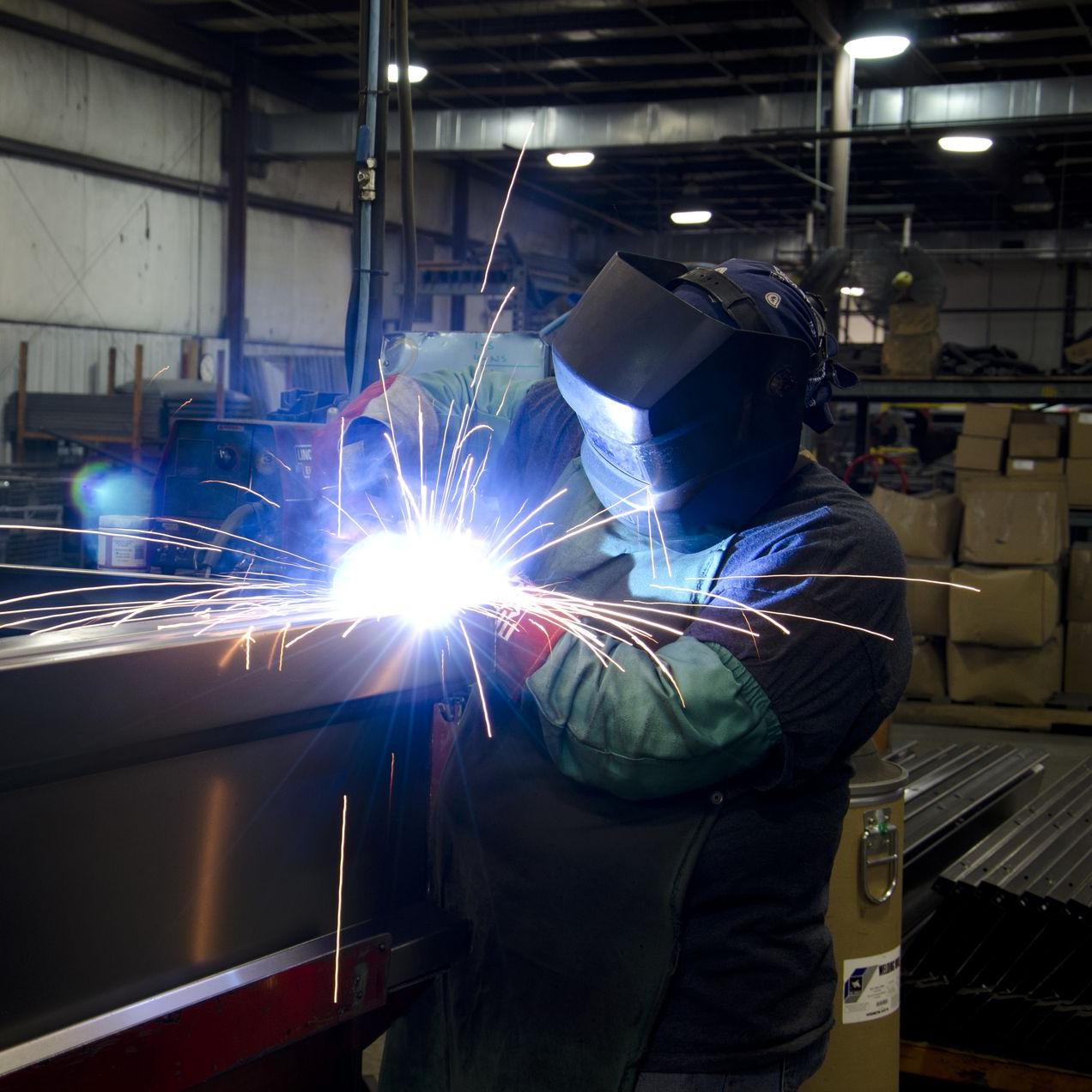 In the metal fabrication department, the process starts with raw metal parts that have been pre-stamped from cold-rolled steel coils. Several welding stations are set up to weld the portion of the casket that forms the box. Simultaneously with the fabrication of the casket box, a group of welders will be welding together the parts of the pre-stamped lid. After all the welds are made on the box and lids, these parts pass through several people who will grind off the excess welds, making all areas of welding smooth. Once all grinding and welding is complete, the casket will then pass through an inspector who inspects the casket for any metal fabrication defects prior to moving forward into the paint department.