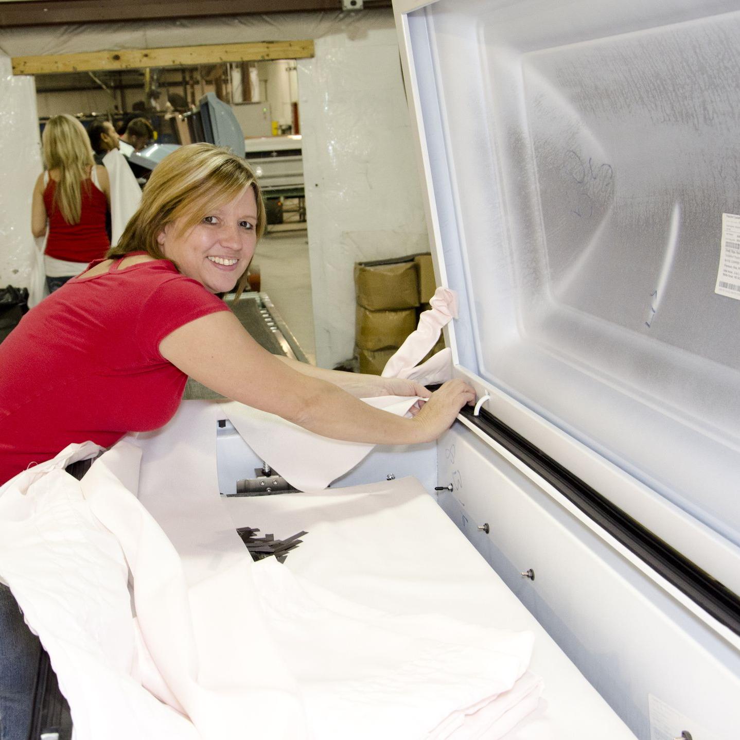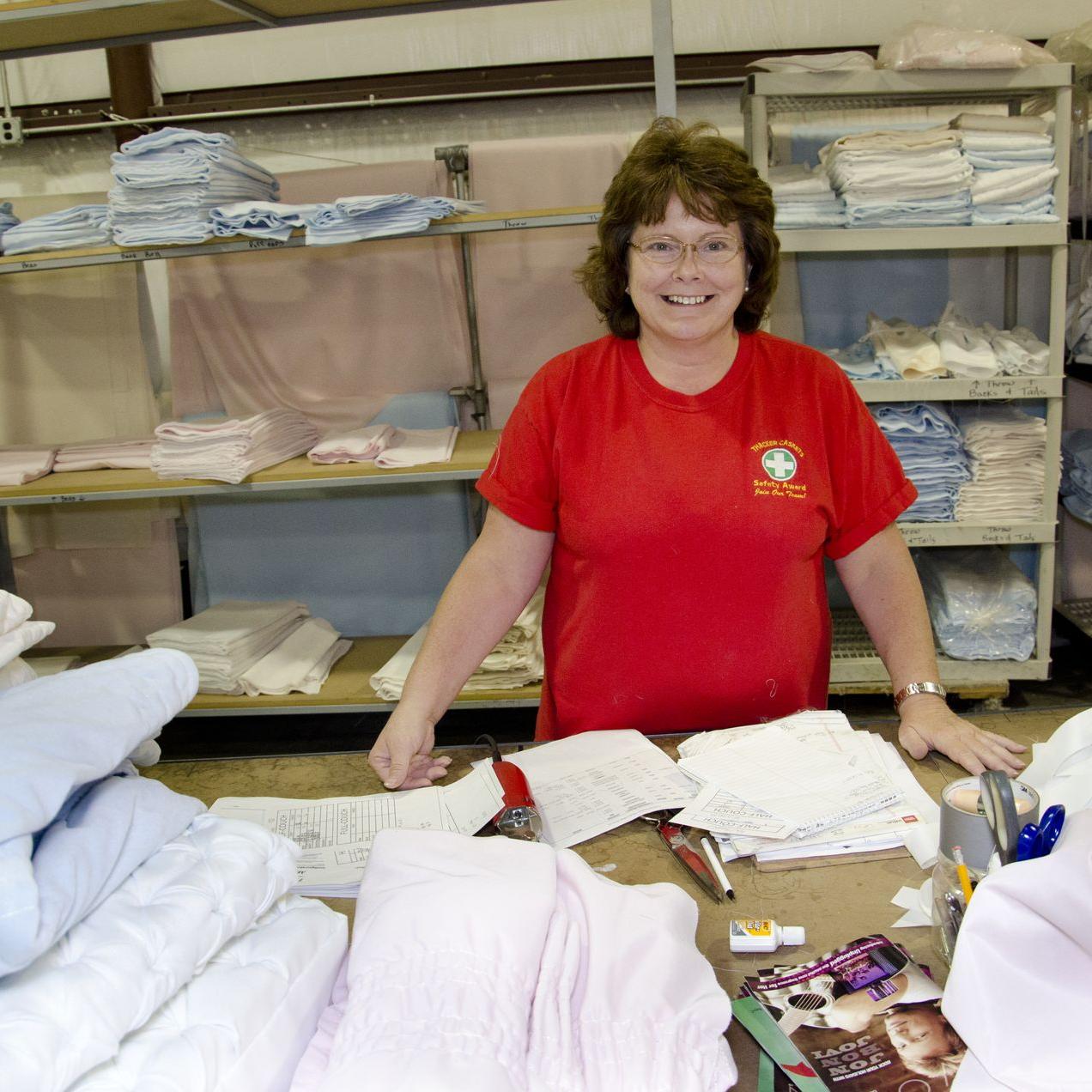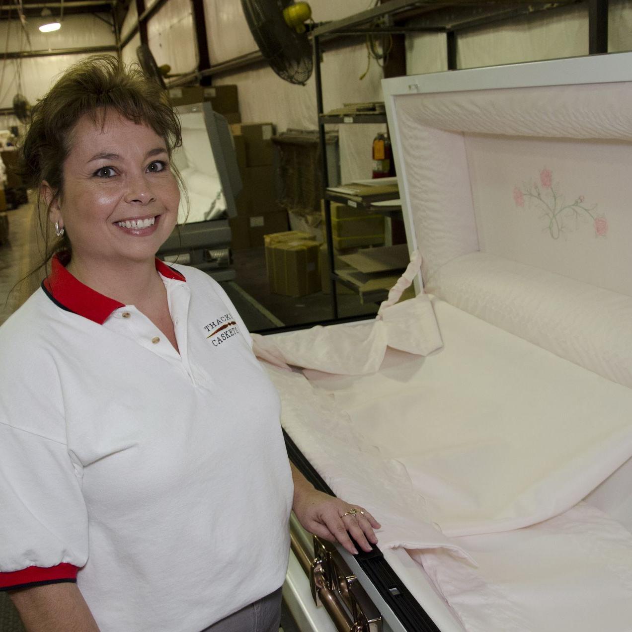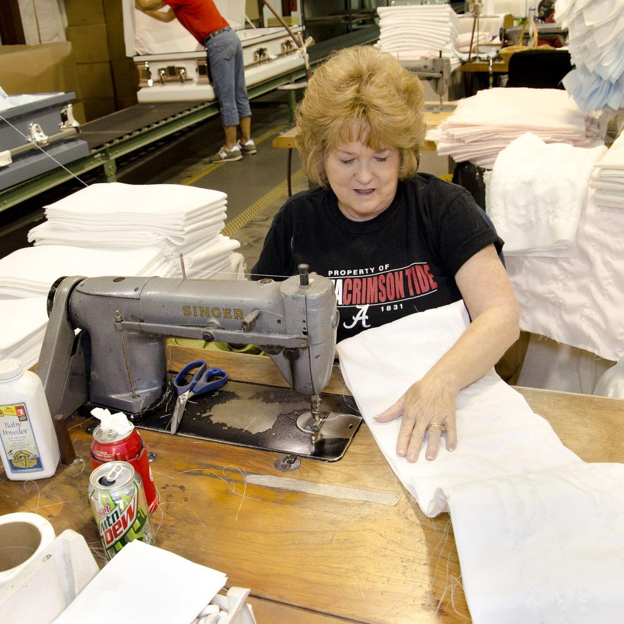 The final stage in the casket assembly is the installation of all the interior fabrics. At the beginning of the process, the fabric is rolled out onto a large (appx. 30 foot) table. A pattern is applied to the fabric and it is cut according to the pattern; one pattern contains all the fabric needed for one individual casket. From the cuts in the pattern, the fabric goes to various sewers who create the interior components. First, the best sheet and interior linings of the casket are installed. Next, other items such as the panel and front drop are installed. Lastly, items such as the overlay and the pillow are placed in the casket. Our interior room also features a custom embroidery area that creates the embroidered themes on Thacker’s most popular models. Thacker also offers custom embroidery for funeral homes to allow a family to further personalize a casket.