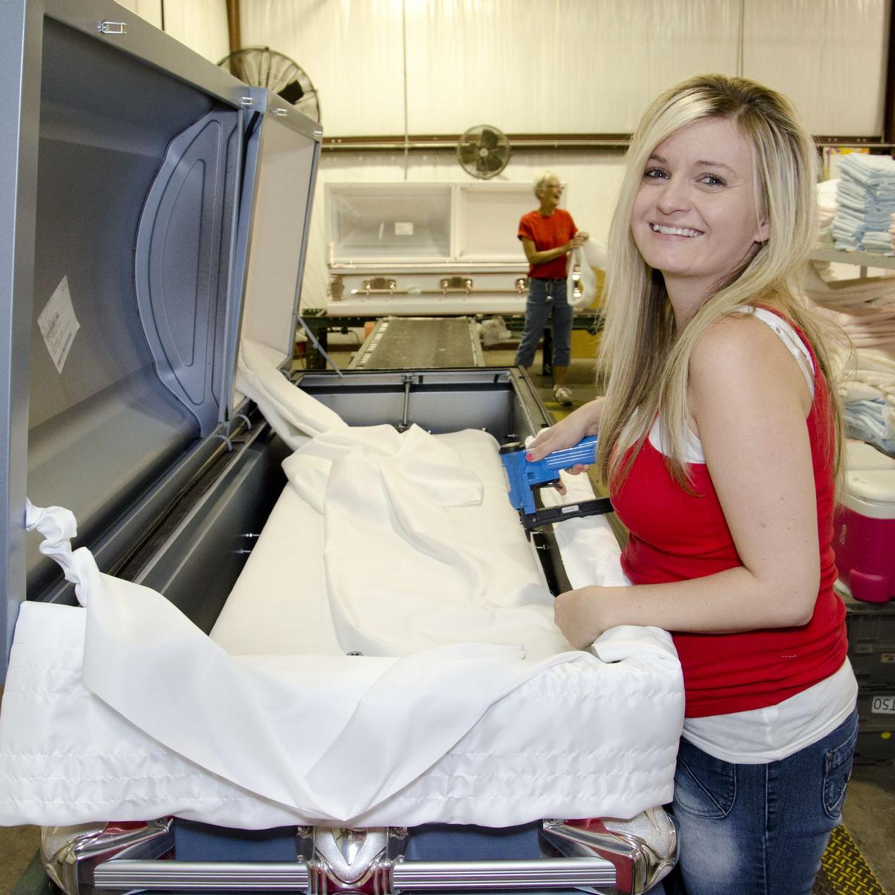 After the casket finishes the paint inspection process, a number of key components are installed on the casket. First, the bottom of the casket is welded into the casket. Afterward, a group of people will install the hardware of the casket according to both style and color specifications. Following the hardware, the bed posts are welded into the casket and the casket bed is installed. Finally, other miscellaneous components such as a gasket, tray liner, and key locking pieces are installed before the casket moves to the interior department.
